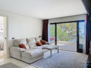 El amplio salón de concepto abierto, desde el que ya se disfrutan las vistas al mar, actúa como el corazón de la vivienda. Con acceso directo a la terraza, conecta de forma armoniosa con todas las estancias, creando un espacio luminoso, acogedor y perfectamente integrado.