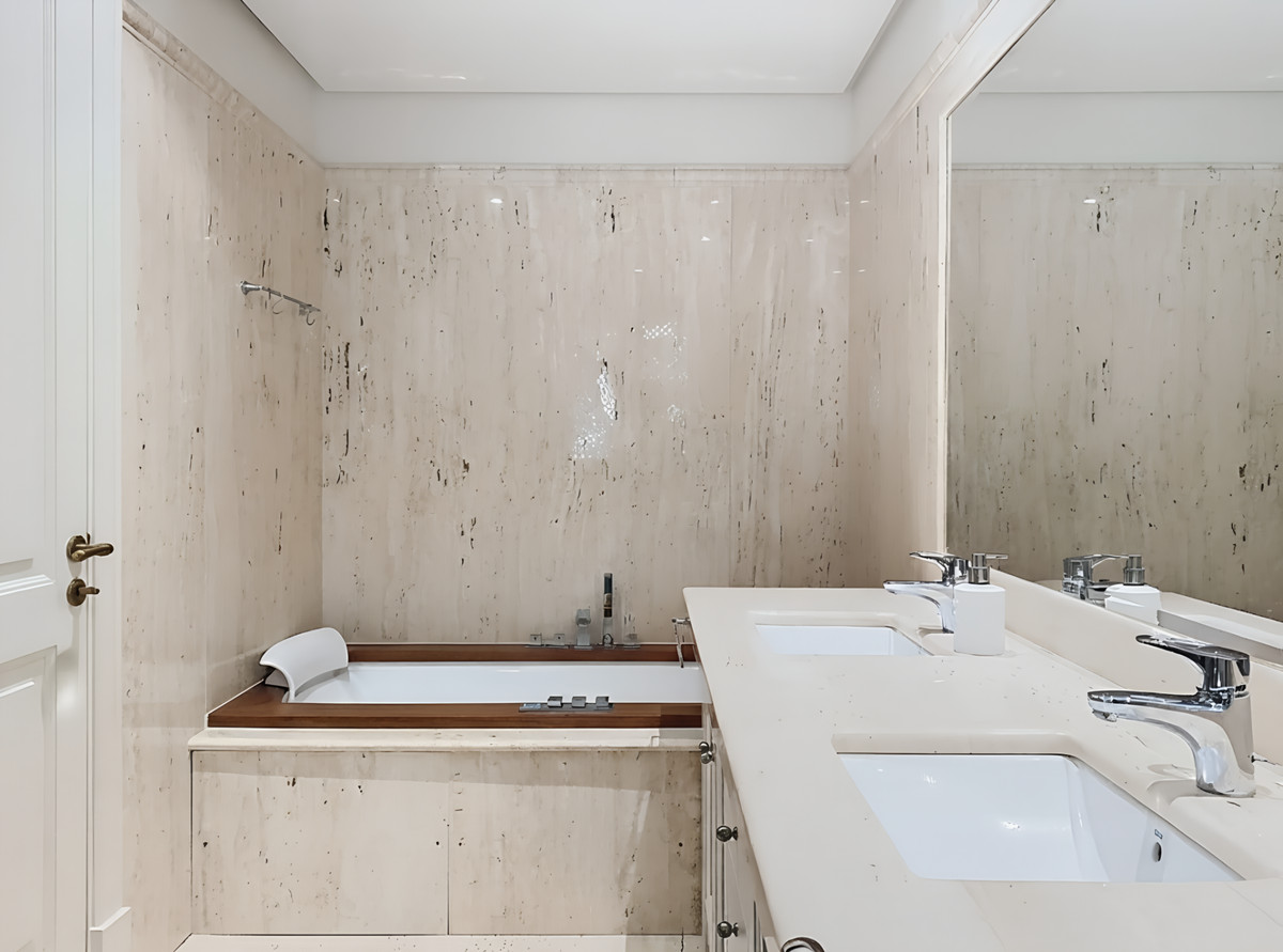 El apartamento ofrece dos dormitorios con baño en suite, concebidos como espacios privados y confortables. La suite principal disfruta de vistas al mar desde la propia cama, acceso directo a la terraza, e incluye un baño privado con doble lavabo, amplia ducha y una elegante bañera de hidromasaje, convirtiéndose en un auténtico refugio de descanso y bienestar. Los baños están equipados con encimeras de mármol TRAVERTINO NAVONNA, grifería HANSGROHE y aparatos sanitarios de primeras marcas como Jacuzzi y Duravit, reflejando un alto nivel de detalle y calidad en cada acabado.
