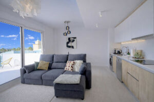 La vivienda destaca por su luminosidad, gracias a sus grandes ventanales de suelo a techo que conectan el interior con una terraza privada, perfecta para disfrutar del clima mediterráneo durante todo el año. Los acabados son modernos y elegantes, con suelos de gres porcelánico, armarios empotrados y baños totalmente equipados que aportan funcionalidad y estilo.