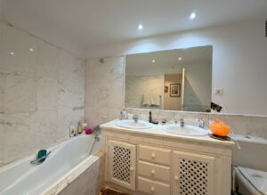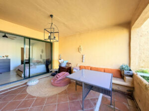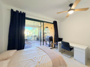 Situado en primera planta, el apartamento ofrece 2 dormitorios y 2 baños, uno de ellos en suite, con acabados elegantes y materiales de alta calidad. El dormitorio principal cuenta con un acogedor vestidor, y tanto desde él como desde el salón se accede a una amplia terraza con vistas a los jardines y a la piscina. Aprovechando la amplitud del salón, se ha añadido una separación con pladur que genera una habitación extra, que puedes mantener como dormitorio adicional o retirar para disfrutar de un salón aún más grande conectado directamente con la terraza.