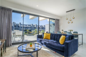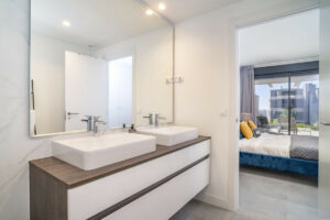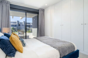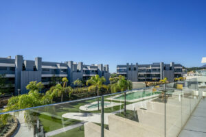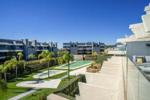 La vivienda disfruta de una privilegiada orientación sur, que permite la entrada de abundante luz natural durante todo el día. El amplio salón-comedor de concepto abierto se conecta de forma armoniosa con una generosa terraza de 27,83 m², creando una perfecta experiencia de vida interior-exterior. Desde aquí se disfrutan vistas abiertas a los cuidados jardines comunitarios y a la piscina, así como una sutil vista al mar Mediterráneo.