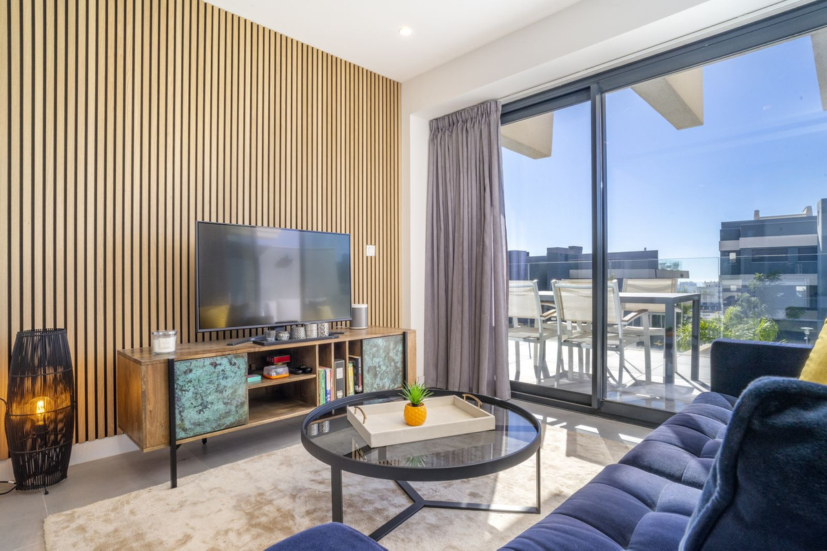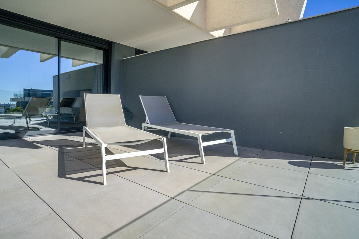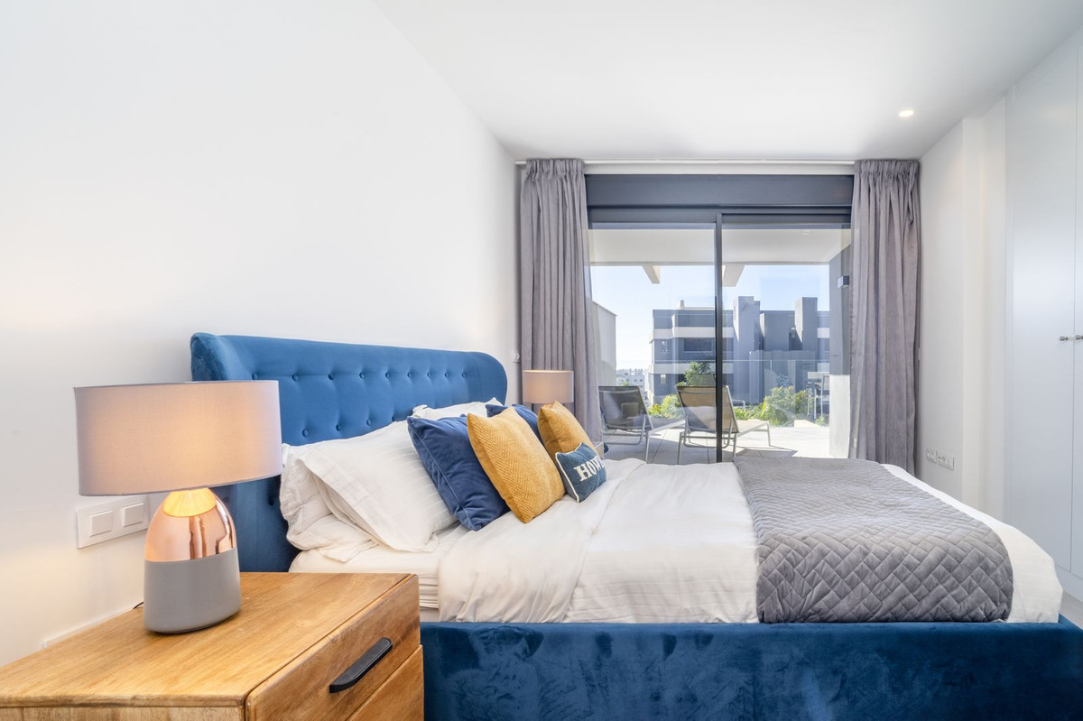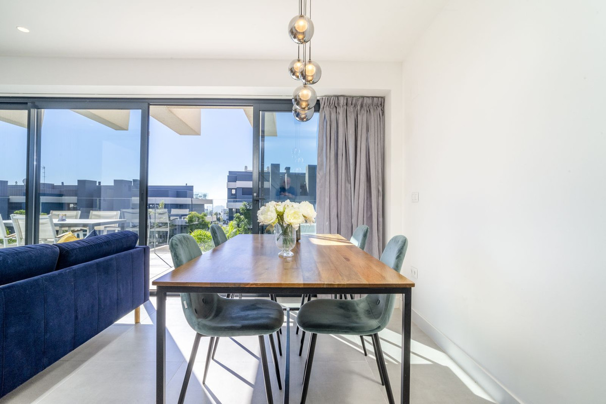La vivienda disfruta de una privilegiada orientación sur, que permite la entrada de abundante luz natural durante todo el día. El amplio salón-comedor de concepto abierto se conecta de forma armoniosa con una generosa terraza de 27,83 m², creando una perfecta experiencia de vida interior-exterior. Desde aquí se disfrutan vistas abiertas a los cuidados jardines comunitarios y a la piscina, así como una sutil vista al mar Mediterráneo.