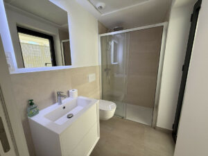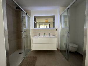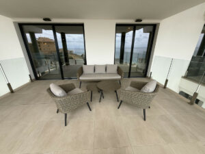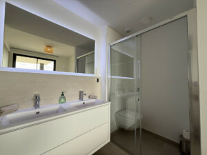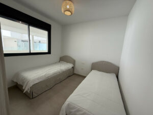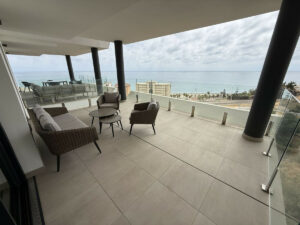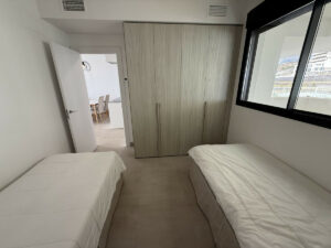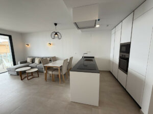 El apartamento ofrece un salón-comedor de concepto abierto, amplio y luminoso, con acceso directo a una espaciosa terraza con vistas panorámicas al Mediterráneo. La cocina, de estilo contemporáneo, está totalmente equipada, y ambos dormitorios son amplios, destacando el dormitorio principal con baño en suite y armarios empotrados. Los acabados son de alta calidad en toda la vivienda, lo que la convierte en una propiedad lista para entrar a vivir.