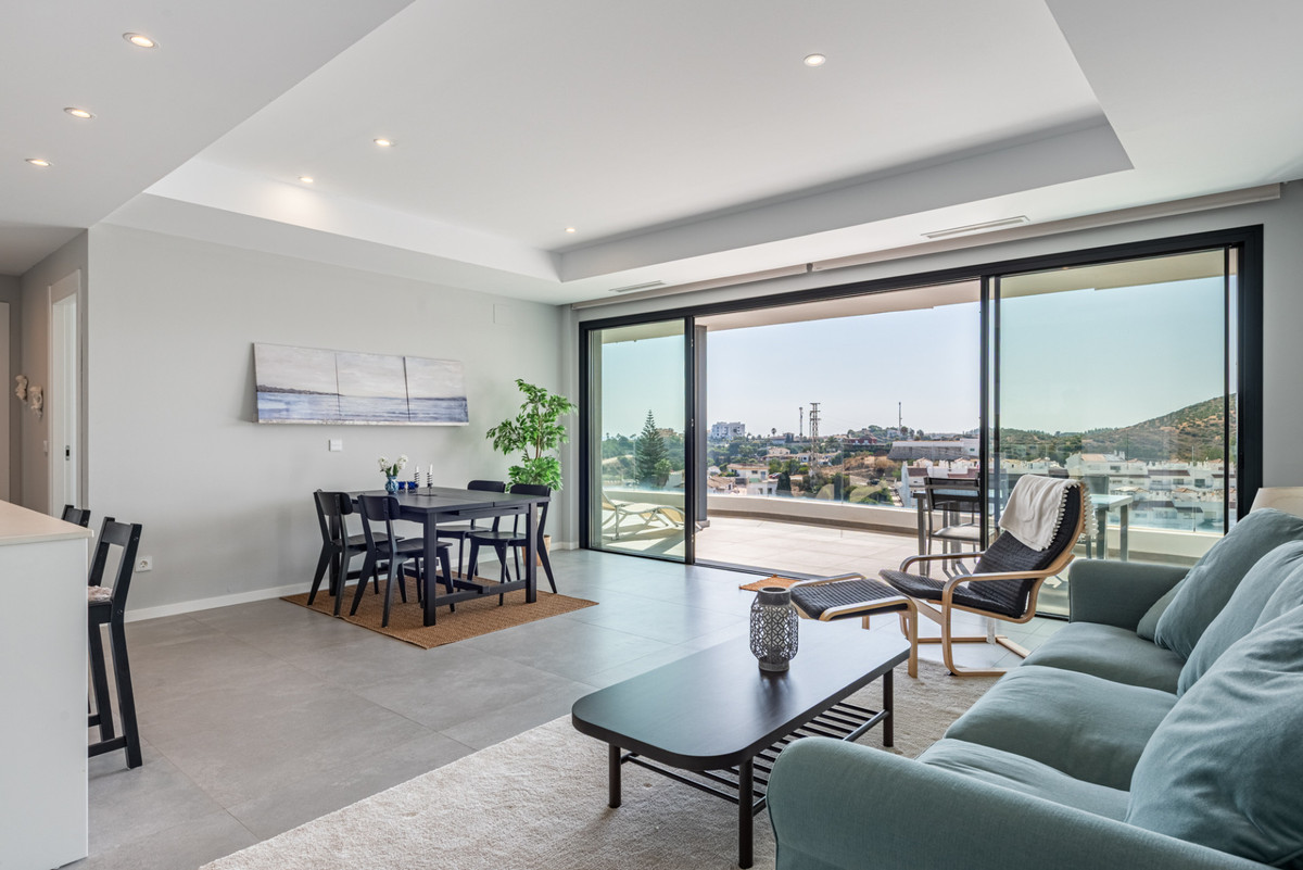 El plano de concepto abierto permite que la luz natural fluya por todo el espacio, conectando el salón, el comedor y la cocina en un ambiente social amplio y acogedor. Desde la espaciosa terraza se pueden disfrutar de impresionantes vistas tanto a las montañas como al mar Mediterráneo — el lugar ideal para tomar el café de la mañana o relajarse contemplando la puesta de sol sobre la costa.