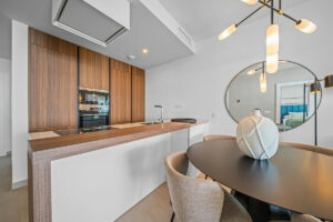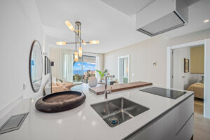 El luminoso salón con cocina abierta está diseñado con elegancia y practicidad, equipado con electrodomésticos de alta gama, y se abre a una amplia terraza con maravillosas vistas al mar Mediterráneo y al parque cercano.
