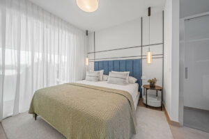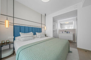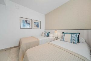 El apartamento dispone de un dormitorio principal con baño en suite y espectaculares vistas al mar, un segundo dormitorio completamente amueblado, un baño independiente y un aseo de cortesía.