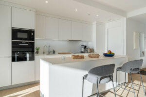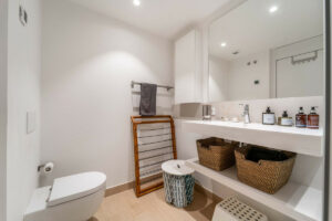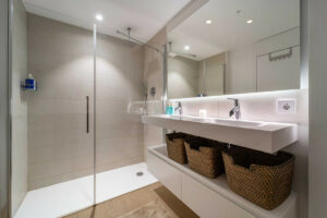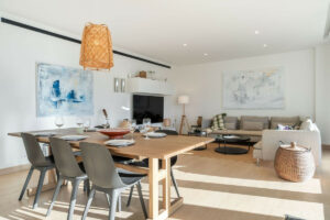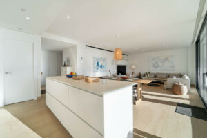 En el interior, cada elemento ha sido diseñado para maximizar el confort y la funcionalidad. La vivienda cuenta con suelo radiante en todas las estancias, creando una temperatura agradable durante todo el año. El salón dispone de persianas eléctricas, y un sistema completo de domótica permite controlar iluminación, climatización y automatización del hogar con total facilidad. Toldos inteligentes, un sistema de filtración de agua de alta calidad y un punto de carga para coche eléctrico en el garaje subterráneo aportan sostenibilidad y comodidad al día a día.