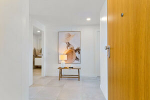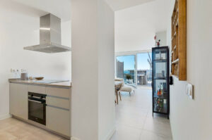 El apartamento cuenta con dos dormitorios amplios, y el dormitorio principal dispone de un baño en suite moderno con ducha. La cocina de concepto abierto se integra de forma natural con el salón, creando un espacio luminoso y confortable.