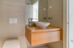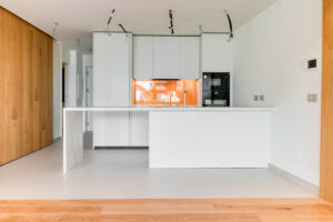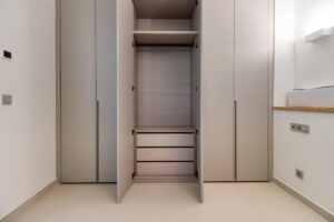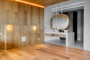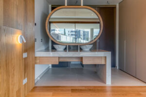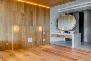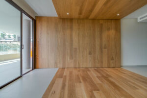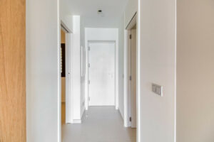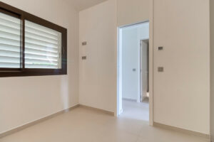Un elemento distintivo es el sistema de pared corredera del dormitorio principal, que se abre completamente hacia el salón, ofreciendo una solución sofisticada y flexible que permite crear un ambiente tipo loft o mantener total privacidad según se desee.