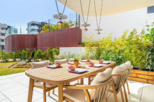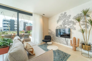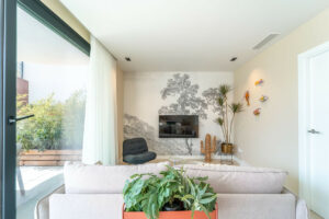 En el interior, cada elemento ha sido diseñado para maximizar el confort y la funcionalidad. La vivienda cuenta con suelo radiante en todas las estancias, creando una temperatura agradable durante todo el año. El salón dispone de persianas eléctricas, y un sistema completo de domótica permite controlar iluminación, climatización y automatización del hogar con total facilidad. Toldos inteligentes, un sistema de filtración de agua de alta calidad y un punto de carga para coche eléctrico en el garaje subterráneo aportan sostenibilidad y comodidad al día a día.