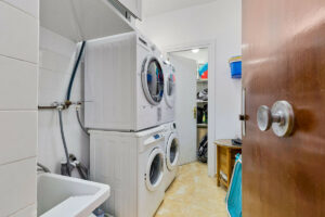 En la escalera exterior del apartamento hay un lavadero compartido con el vecino más cercano; cada uno tiene su propia lavadora y secadora, y también hay un trastero.