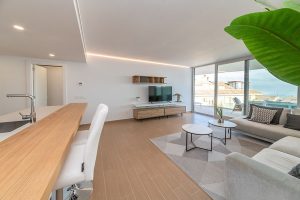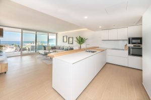 La vivienda ofrece una distribución luminosa y bien aprovechada, con grandes ventanales que aportan una sensación de amplitud y mucha luz natural. La cocina moderna está integrada con el salón, creando un espacio cómodo, acogedor y perfecto para disfrutar en compañía. Desde aquí se accede a la amplia terraza con bonitas vistas al mar, ideal para desayunar al sol, cenar con amigos o relajarse durante todo el año.