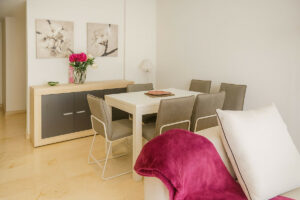 Avanzando, se accede a un amplio salón con espacio suficiente para zona de estar y comedor. Los grandes ventanales/puertas correderas conectan con una amplia terraza, desde la cual se disfrutan vistas a los jardines comunitarios bien cuidados, un lugar perfecto tanto para desayunar como para relajarse al final del día.