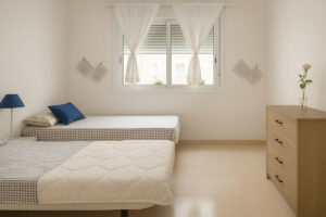 La vivienda cuenta con dos dormitorios de buen tamaño, ambos tranquilos, privados y luminosos. El principal destaca por su excelente entrada de luz natural, mientras que el segundo ofrece versatilidad como habitación de invitados o despacho. La distribución es funcional y aprovecha bien el espacio y la luz.