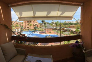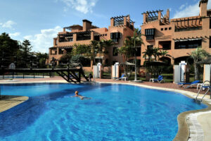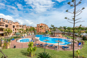 Apartamento en primera planta, magníficamente ubicado en la codiciada urbanización Hacienda del Sol. La vivienda cuenta con un amplio dormitorio principal con baño en suite, un segundo dormitorio y un baño familiar. La terraza ofrece vistas a una de las impresionantes piscinas, convirtiéndolo en el hogar vacacional perfecto. La venta incluye plaza de aparcamiento y trastero.