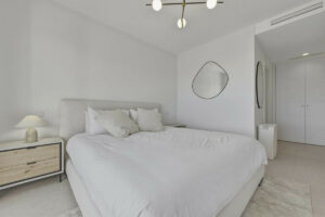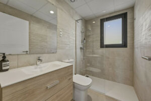 La suite principal disfruta de acceso directo a la terraza principal, permitiendo apreciar las vistas panorámicas al golf tanto desde el interior como desde el exterior. El baño en suite es amplio y contemporáneo, con ducha a ras de suelo y doble lavabo.