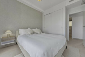 El segundo dormitorio también cuenta con acceso directo a la terraza y las mismas hermosas vistas, lo que lo hace ideal para invitados o familiares. Un segundo baño moderno con ducha a ras de suelo completa la vivienda.