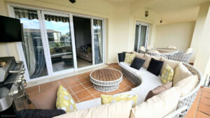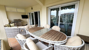 Una acogedora terraza de 12 m², equipada con tumbonas de primera calidad, mesa de comedor y sillas, perfecta para disfrutar del clima mediterráneo durante todo el año.