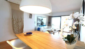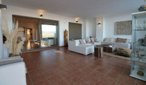 Cada detalle de este apartamento ha sido cuidado con la máxima atención. La entrada se abre a un salón amplio y luminoso. Este espacio de convivencia se integra armoniosamente con la terraza, transformada en un gran salon donde la luz del sol crea un ambiente cálido y acogedor. Dos terrazas, abiertas y privadas, invita a relajarse admirando las vistas panorámicas al mar, las majestuosas montañas, el campo de golf y la piscina.