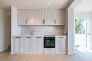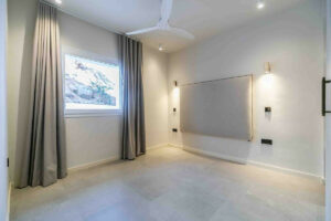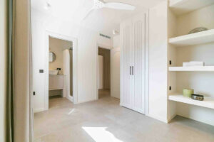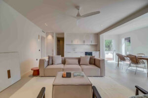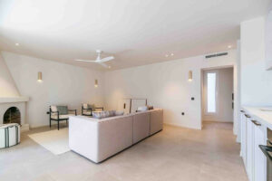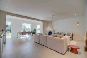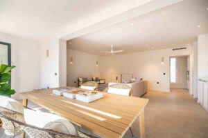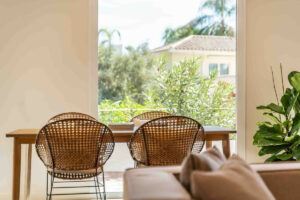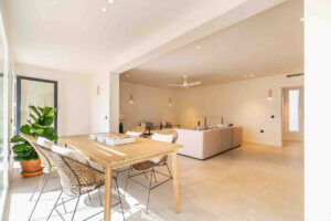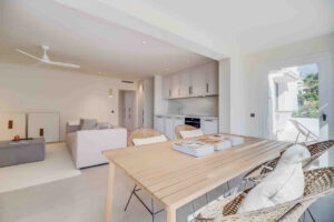 El amplio salón con cocina abierta marca inmediatamente el tono: luminoso, amplio y pensado para un día a día sin complicaciones. Los grandes ventanales permiten que la luz entre de forma natural y conectan la vivienda con la terraza orientada al suroeste, una extensión exterior del salón donde disfrutar de tardes cálidas, puestas de sol doradas y la suave brisa mediterránea durante todo el año.