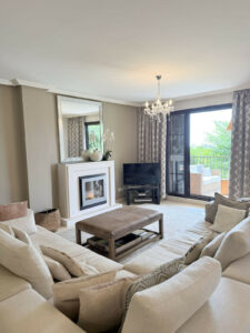 Al entrar, encontrará un amplio salón-comedor de concepto abierto, bellamente presentado, con un gran sofá esquinero, espacio para seis personas y una atractiva chimenea. Dos puertas dobles ofrecen acceso directo a una terraza cubierta privada orientada al sur, ideal para comer y disfrutar al aire libre, además de un amplio jardín esquinero que ofrece un amplio espacio exterior.