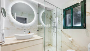 El dormitorio principal está dispuesto como una suite tranquila y privada, con acceso a la terraza y un baño contiguo. El segundo dormitorio también disfruta de terraza y baño independiente, ideal para invitados o familiares. Pasillos adicionales y un discreto cuarto de servicio aseguran una circulación fluida y comodidad.