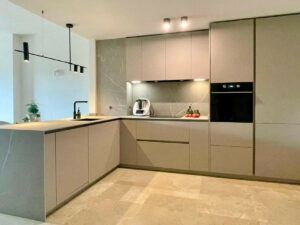 Se abre a una zona de lavandería equipada con armarios a medida, ofreciendo un espacio de almacenaje práctico y estético — algo poco común en este tipo de propiedades.