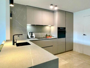 La cocina italiana, nueva y de alta gama, combina diseño y funcionalidad: encimera y salpicadero de piedra, todos los muebles bajos con cajones, etc.