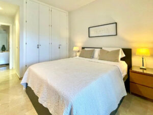 La zona de noche cuenta con dos dormitorios cómodos con armarios empotrados y dos baños, uno de ellos en suite. El suelo de mármol aporta una elegancia atemporal al conjunto.