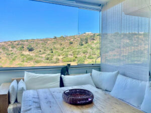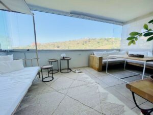 El amplio salón se abre a una terraza orientada al suroeste, convertida en una verdadera estancia adicional gracias a las “cortinas de cristal”. Estas cristaleras modulables permiten disfrutar del espacio en cualquier estación: totalmente abiertas en verano, parcialmente o completamente cerradas el resto del año.