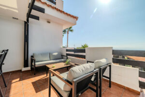 Accede a un amplio y luminoso salón de planta abierta que se integra a la perfección con una gran terraza privada, ideal para cenar al aire libre, recibir invitados o simplemente disfrutar del sol con impresionantes vistas al mar y a la montaña.
