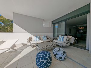 Apartamento en venta en , Manilva con 2 dormitorios, 2 baños y con orientación sur, con piscina comunitaria y garaje privado (1 plazas). Respecto a las dimensiones, la propiedad presenta 87 m² construidos y 29 m² de terraza. Tiene las siguientes características servicios cercanos, transporte cercano, aire acondicionado, cocina totalmente equipada, trastero, sauna, almacén, gimnasio, alarma, entrada de seguridad, cristal doble, terraza privada, cocina equipada, vistas al mar, lavadero, internet – wi-fi, terraza cubierta, persianas eléctricas, armarios empotrados, comunidad cerrada, ascensor, cerca de playa / mar, cerca del golf, terraza descubierta, sala de juegos, puertas de cristal, balcón, muebles opcionales, balneario – spa, accesible para movilidad reducida, excelente estado, tiendas cerca, cerca de la ciudad, cerca del puerto, colegios cerca, cámaras de vigilancia y animales permitidos.