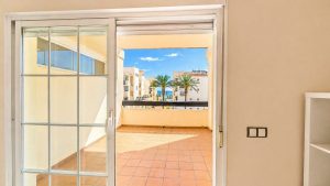 Balcón y vistas de este apartamento en venta en Manilva