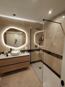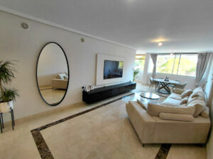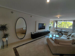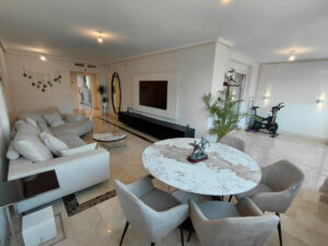 Acabados de primera calidad: suelos de mármol, ventanas correderas de aluminio con doble acristalamiento, aire acondicionado, toldos y cerramientos de gran aislamiento.