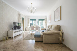 – Gran salón-comedor con salida directa a una fantástica terraza cubierta de 31 m², con adorables vistas a los jardines tropicales y piscinas del complejo.