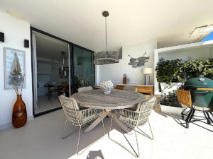 Las amplias puertas de cristal se abren a la amplia terraza, creando una perfecta integración entre el interior y el exterior, realzada por la privilegiada orientación sur de la propiedad.