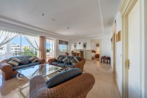 Este amplio apartamento en el reconocido Edificio Guadalpin ofrece agradables vistas al mar, una generosa terraza y una ubicación inmejorable a pocos minutos caminando de la playa y de algunos de los lugares más emblemáticos de Marbella.