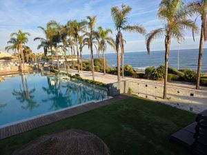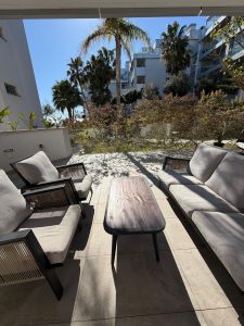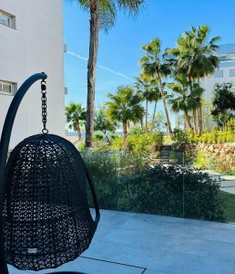 Moderno apartamento en planta baja con vistas al mar situado en el exclusivo Residencial Mediterráneo en Mijas Costa.