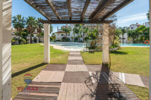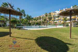 El complejo cuenta con 2 piscinas, pistas de pádel , parques infantiles , zonas ajardinadas, fuentes, estanques y un largo etc.