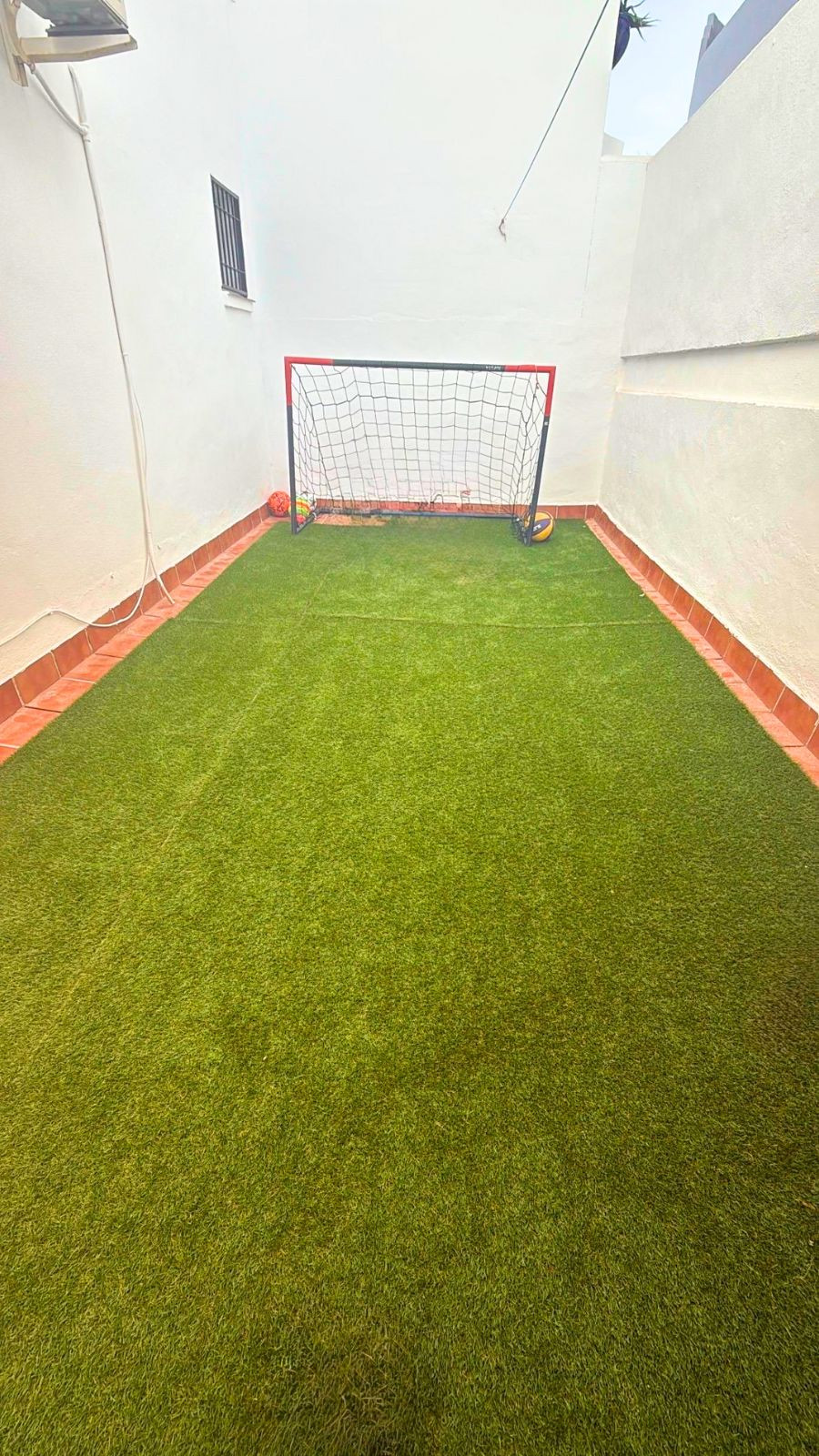 Uno de los grandes atractivos de esta propiedad es su terraza privada, ideal para disfrutar del clima mediterráneo. Tal como se aprecia en las imágenes, el espacio exterior combina una zona de terraza con suelo cerámico, perfecta para crear un rincón de descanso o comidas al aire libre, y un área adicional con césped artificial, ideal para familias, mascotas o simplemente para disfrutar de un ambiente más verde y relajado.