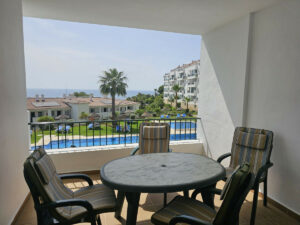 El apartamento, situado en una primera planta y con orientación sur, garantiza una luminosidad excepcional . Consta de dos amplios dormitorios, dos baños completos (uno de ellos en suite), una cocina equipada con lavadero y un salón-comedor de generosas dimensiones. Desde la agradable terraza, disfrutarás de inmejorables vistas al mar y a la piscina.