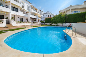 La propiedad cuenta con dos amplios dormitorios, un baño moderno, un aseo de invitados, una cocina independiente totalmente equipada y un luminoso salón-comedor con acceso a una generosa terraza orientada al sur con vistas a los jardines y la piscina comunitarios.