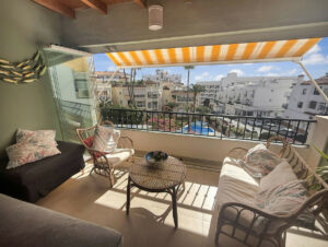La vivienda cuenta con dos dormitorios, dos baños y un luminoso salón que se abre a una terraza orientada al sur de aproximadamente 12 m². Gracias a las cortinas de cristal abatibles, la terraza se puede disfrutar durante todo el año, abierta en verano o cerrada en los días más frescos.