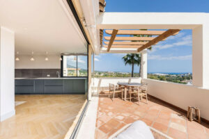 Bienvenido a este apartamento recientemente reformado con buen gusto en Palacetes de Belvederes en Nueva Andalucia. Al entrar, le recibe un amplio espacio abierto, luminoso y con la sensación de un loft. Todos los materiales han sido cuidadosamente seleccionados por el actual propietario y se han combinado con gran gusto, como la cocina de diseño con electrodomésticos Gaggenau y el suelo de madera en espiga de Dinamarca. Su ubicación le da la sensación de un ático y podrá disfrutar de fantásticas vistas al mar y a la montaña desde su amplia terraza. Dispone de una amplia plaza de aparcamiento en el sótano, aparcamiento para buggies y un amplio trastero. Esta urbanización de estilo boutique cuenta con jardines bien cuidados, gimnasio y piscina.