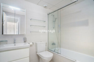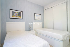 El apartamento dispone de dos dormitorios bien proporcionados. El dormitorio principal cuenta con baño en suite y acceso directo a una de las terrazas, creando una perfecta integración entre el interior y el exterior. El segundo dormitorio está atendido por un baño completo para invitados, ubicado en el pasillo y equipado con ducha, lo que lo hace ideal para familiares o visitantes.