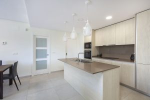 Al entrar, le recibe una amplia cocina de planta abierta que se integra a la perfección con el salón. La cocina cuenta con una isla que proporciona espacio adicional en la encimera, así como un lavadero contiguo para mayor comodidad. La estancia está bañada por la luz natural que entra a través de las grandes puertas correderas de cristal, que dan acceso directo a la espaciosa terraza privada del apartamento. Aquí podrá disfrutar del sol de la tarde y del atardecer mientras contempla las vistas despejadas.El dormitorio principal cuenta con un amplio baño en suite, mientras que el segundo dormitorio también tiene acceso directo a la terraza. Un segundo baño con ducha se encuentra convenientemente situado junto al dormitorio.