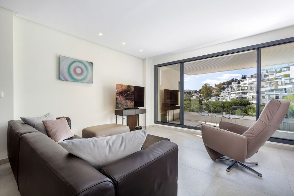 Al entrar, le recibe una amplia cocina de planta abierta que se integra a la perfección con el salón. La cocina cuenta con una isla que proporciona espacio adicional en la encimera, así como un lavadero contiguo para mayor comodidad. La estancia está bañada por la luz natural que entra a través de las grandes puertas correderas de cristal, que dan acceso directo a la espaciosa terraza privada del apartamento. Aquí podrá disfrutar del sol de la tarde y del atardecer mientras contempla las vistas despejadas.El dormitorio principal cuenta con un amplio baño en suite, mientras que el segundo dormitorio también tiene acceso directo a la terraza. Un segundo baño con ducha se encuentra convenientemente situado junto al dormitorio.