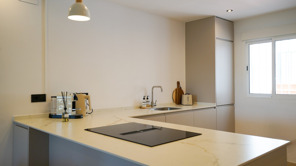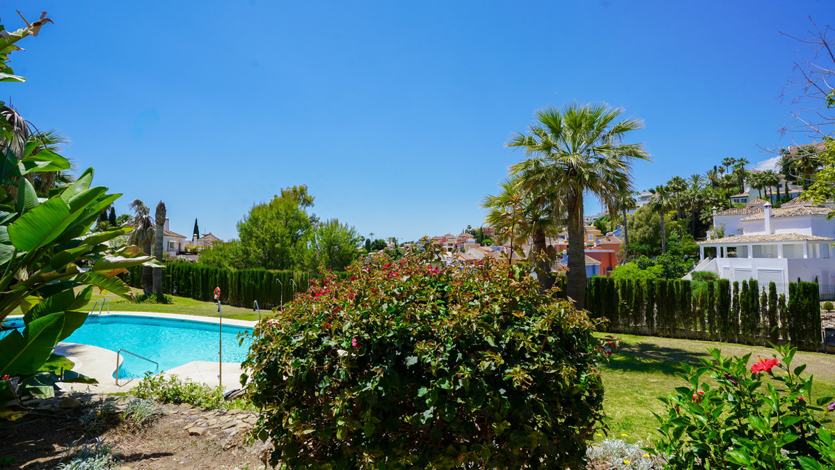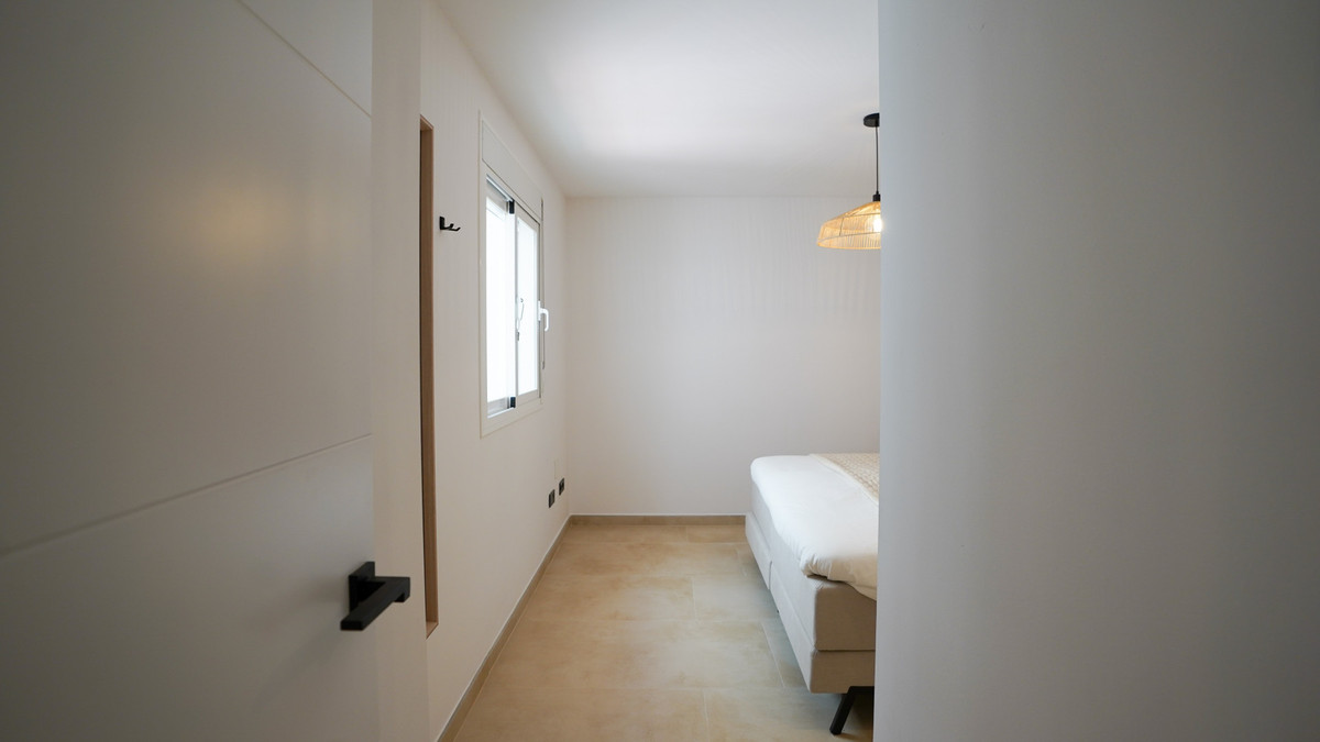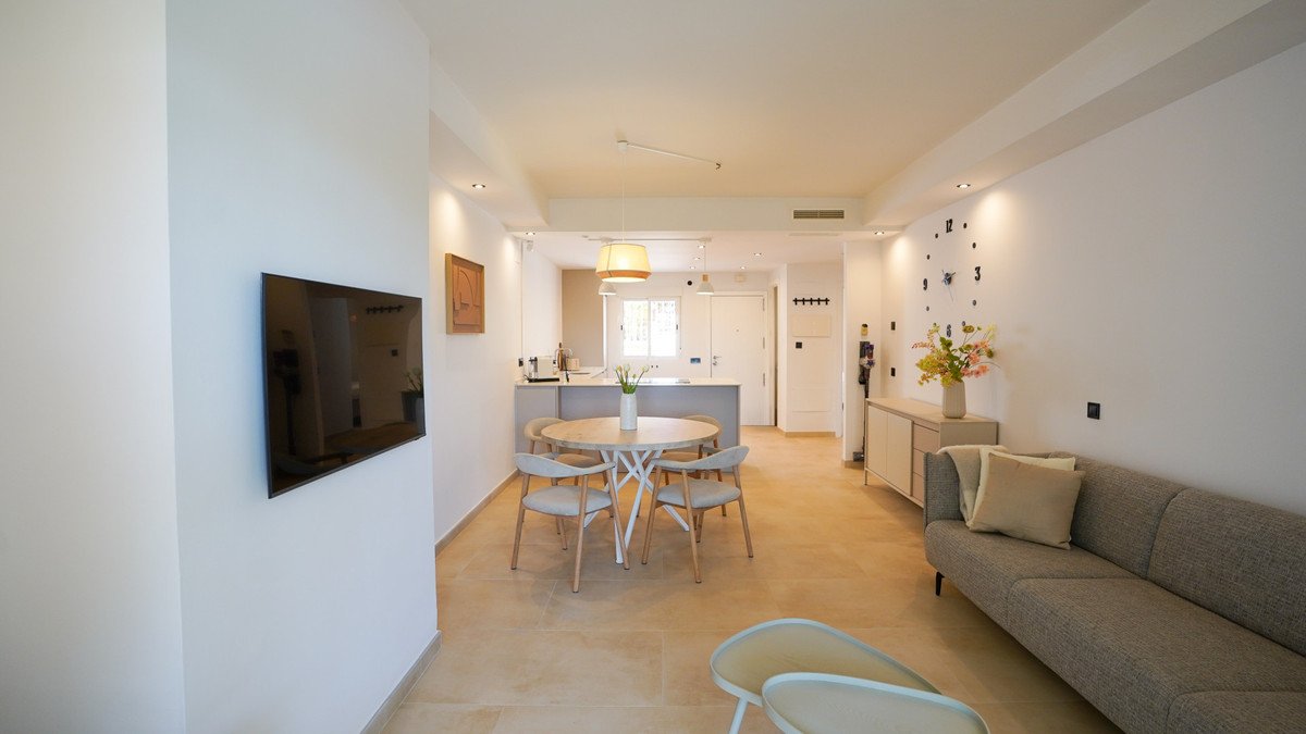 El apartamento cuenta con dos amplios dormitorios y dos modernos baños, todos recientemente reformados con los más altos estándares. El salón-comedor de planta abierta se conecta directamente con una terraza privada cubierta con vistas al jardín y la piscina, ideal para comer al aire libre o relajarse bajo el sol. Doble acristalamiento de alta calidad, aire acondicionado y sistema de alarma moderno garantizan confort y seguridad durante todo el año, mientras que los armarios empotrados ofrecen un amplio espacio de almacenamiento.