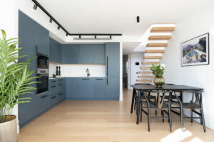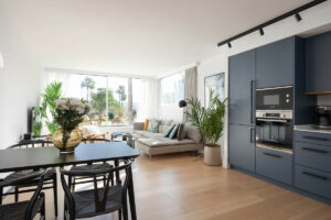 La cocina totalmente equipada fluye perfectamente en un luminoso salón y comedor de planta abierta, lleno de luz natural. Arriba, se encuentra una amplia terraza privada, perfecta para tomar el sol, comer alfresco, o simplemente relajarse rodeado de vegetación y vistas panorámicas.