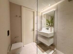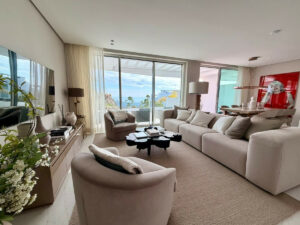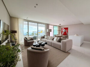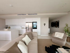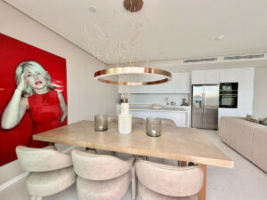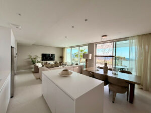 El apartamento cuenta con un diseño contemporáneo de planta abierta que integra salón y comedor con cocina moderna, diseñado para maximizar el espacio y la luz natural. Su orientación sur asegura que los interiores se llenen de sol durante todo el día, mientras que la espaciosa terraza privada ofrece impresionantes vistas al mar.
